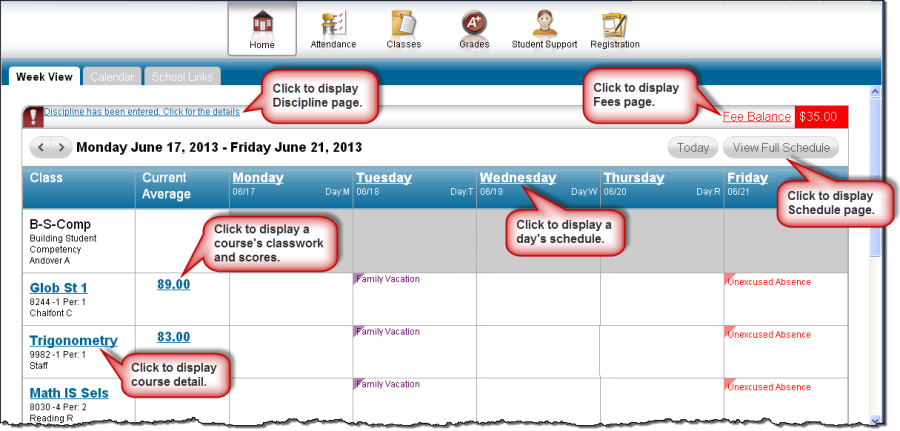 You can view information for the current week, as well as previous and future weeks in the current school year. In addition, you can use the page's links to access detailed information on these records.