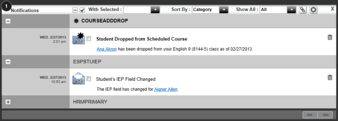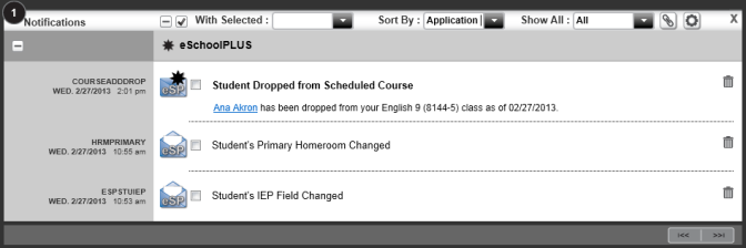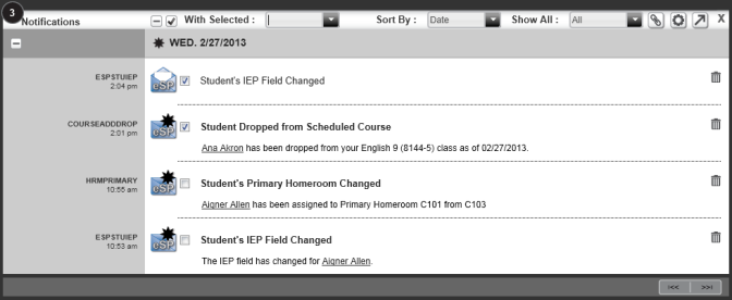 This function works in conjunction with the "With Selected" field. indicates a notification is selected.