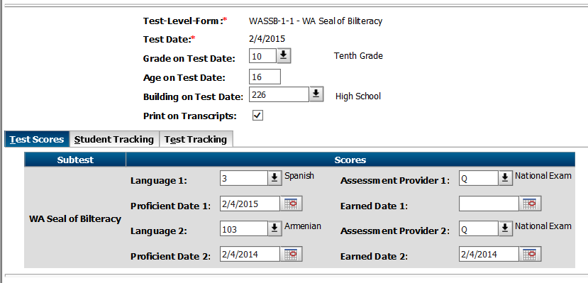 - The scores will have a number for each set of Seal of Biliteracy Language. For transcripts, the Transcript View Setup will indicate which fields to use for Seal of Biliteracy set. For CEDARS, the score's state code equiv with the set number will be used to group each set for a program record.