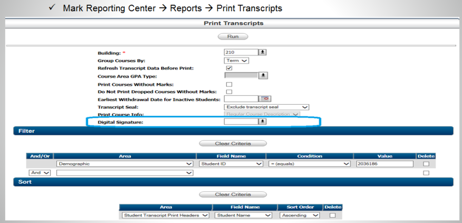 There is a new security MR – REPORTS – TRNSIGN for the Digital Signature. Only staff members, who have this security, will be able to see the Digital Signature prompt and choose a staff member to print on the transcript.